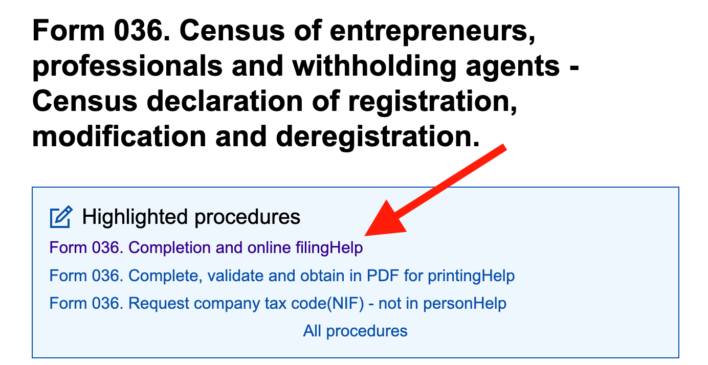Use model 036 through “Censos WEB” (AEAT’s online census service) to declare your activity, choose your VAT/IRPF regimes, and select your IAE epígrafe (your activity code).