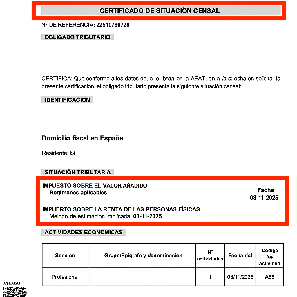 - El certificado de situación censal, que muestra tu censo fiscal completo: fecha de inicio, dirección, regímenes y epígrafe IAE.